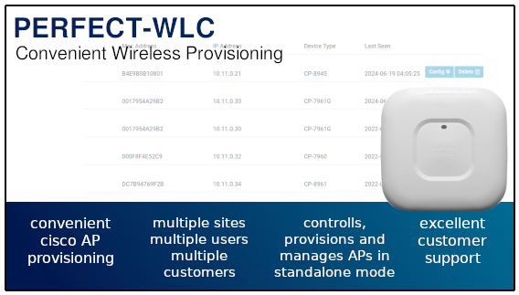 - Controller Wifi PERFECT-WLC Un sistem de provizionare simplu, intuitiv, usor de folosit care permite gestionarea echipamentelor wifi Cisco. Platforma a fost creata pentru a profita de excesul de echipamente Wifi Cisco existente in piata. Aceste echipamente sunt deosebit de fiabile si ofera performante ridicate la preturi foarte mici.